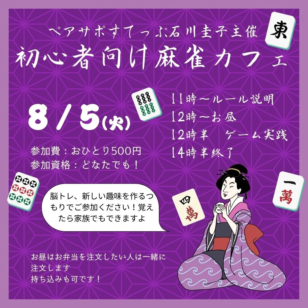 8月5日、当法人の石川圭子主催による「夏休み特別企画 初心者向けの麻雀カフェ」を開催しました。